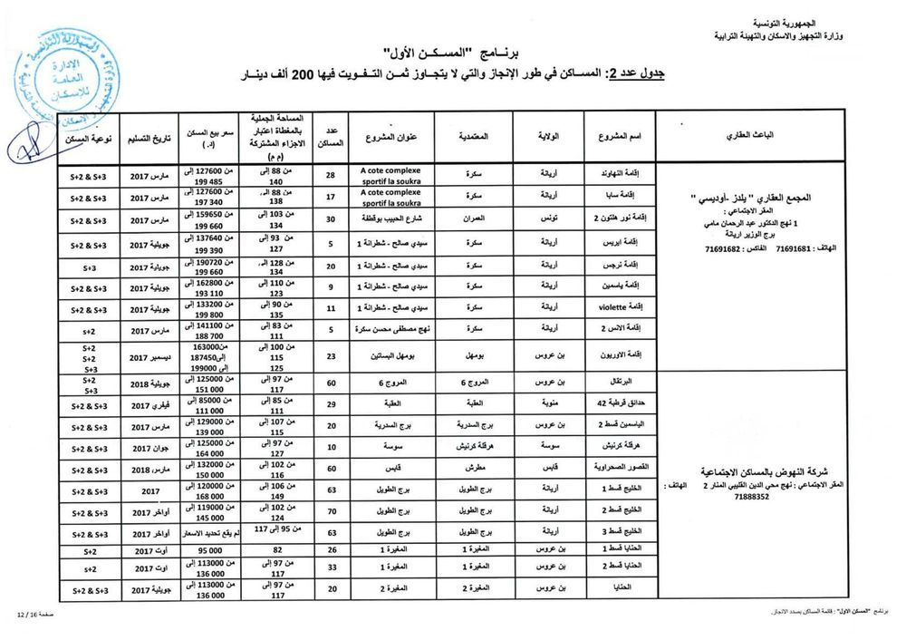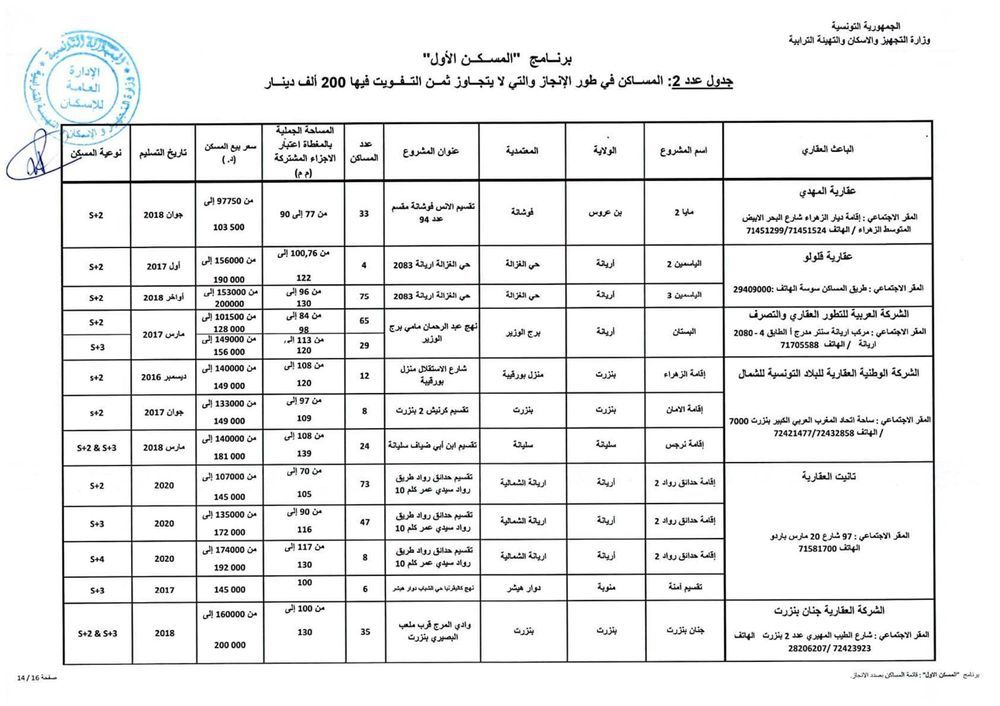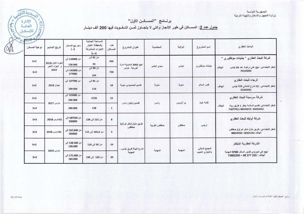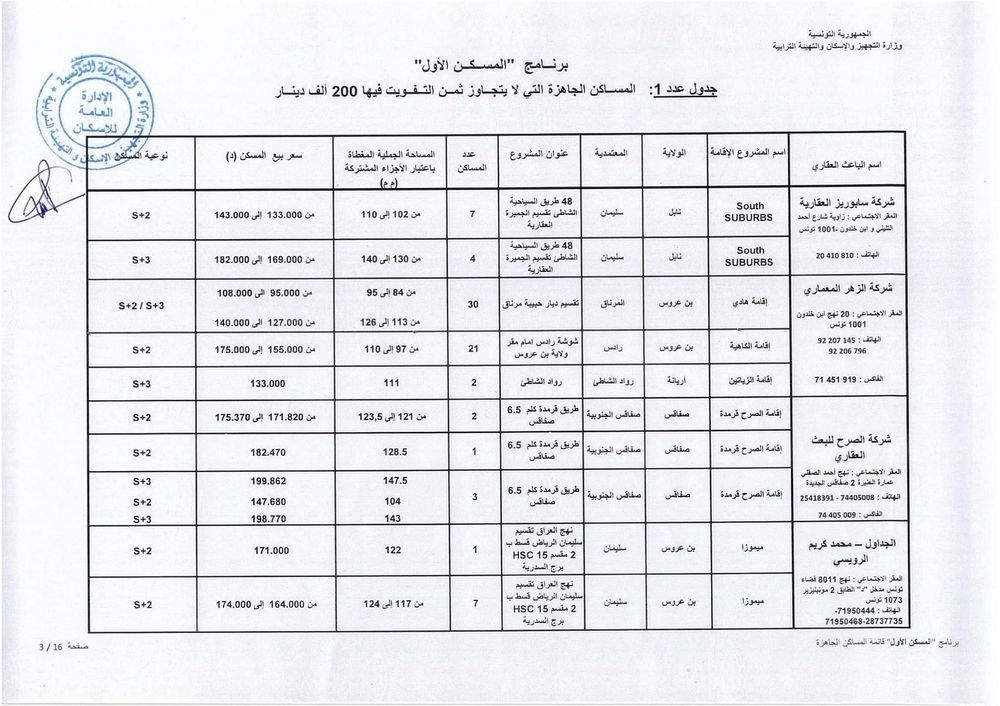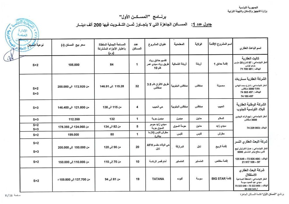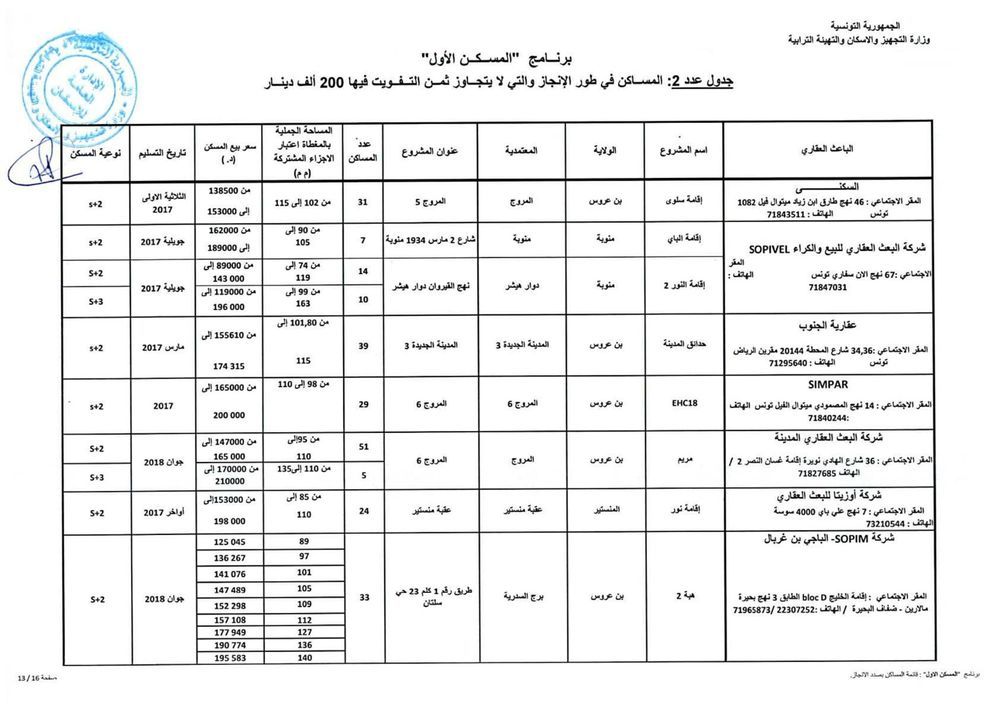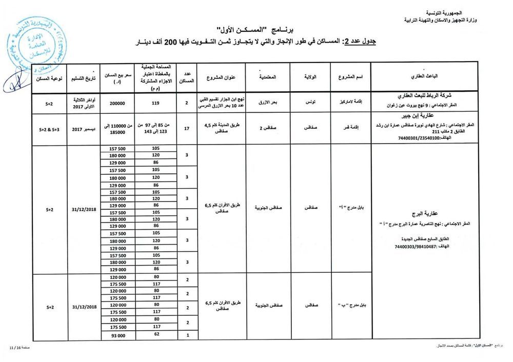 وحسب رئيس الغرفة النقابية للباعثين العقاريين بالبلاد التونسية، فهمي شعبان، هناك حوالي 1012 مسكنا جاهزا موزعا على 15 جهة موضوعا على ذمة البرنامج باسعار تتراوح حسب المناطق، بين 110 الف دينار و200 الف دينار. وتضم هذه المساكن على الاقل قاعة جلوس وغرفتين يقع التفويت فيها لفائدة المنتفعين بعد امضاء وثيقة حجز (بين الباعث العقاري والحريف) في اجل اقصاه 45 يوما.