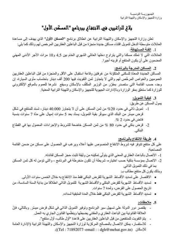 وكان صدر بالرائد الرسمي للجمهورية التونسية أمر حكومي عدد 161 لسنة 2017 مؤرخ في 31 جانفي 2017 يتعلق بضبط شروط الانتفاع ببرنامج المسكن الأول وصيغ وشروط الانتفاع بالقرض الميسر لتغطية التمويل الذاتي وإجراءات إسناده.