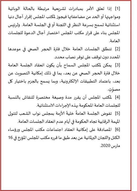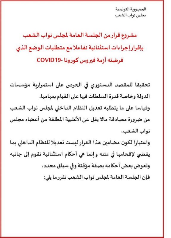 صادق مجلس نواب الشعب خلال جلسة عامة اليوم الخميس 26 مارس 2020، على مشروع قرار يقضي بلاتخاذ إجراءات استثنائية، تفاعلا مع متطلبات الوضع الذي فرضته أزمة فيروس كورونا -COVID19 بـ 122 نعم 17 إحتفاظ و03 رفض.
