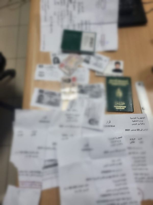 و تمّ تنشيط العمل الاستعلامي أين امكن التعريف به و الذي اتضح أنّه محل عدد 3 مناشير تفتيش و بعد استشارة النيابة العمومية ببن عروس تم القاء القبض على المعني و بتفتيش محل سكناه بجهة المروجات تم حجز مجموعة من الوثائق مفتعلة و مرمية بالتدليس الذي بدوره اقر و انه يقوم بافتعال الوثائق و استخراجها من محل اعلامية بجهة المروجات.