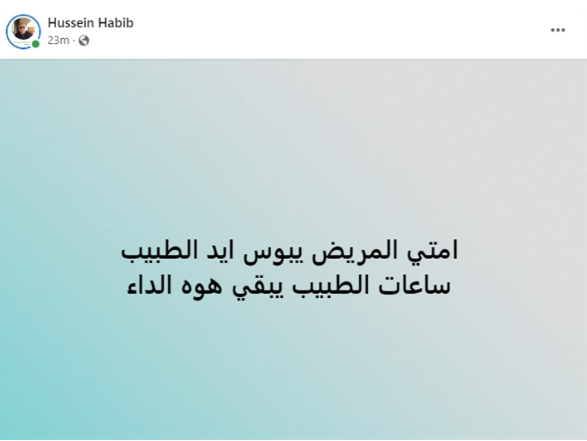 وكتب حسين حبيب في تدوينة على حسابه بموقع الفيسبوك قال فيها: "امتا المريض يبوس ايد الطبيب.. ساعات الطبيب يبقى هو الداء".