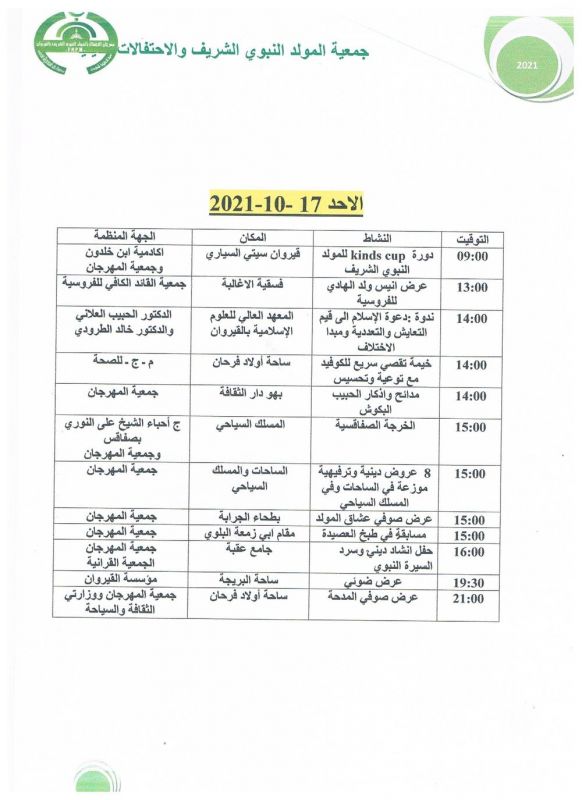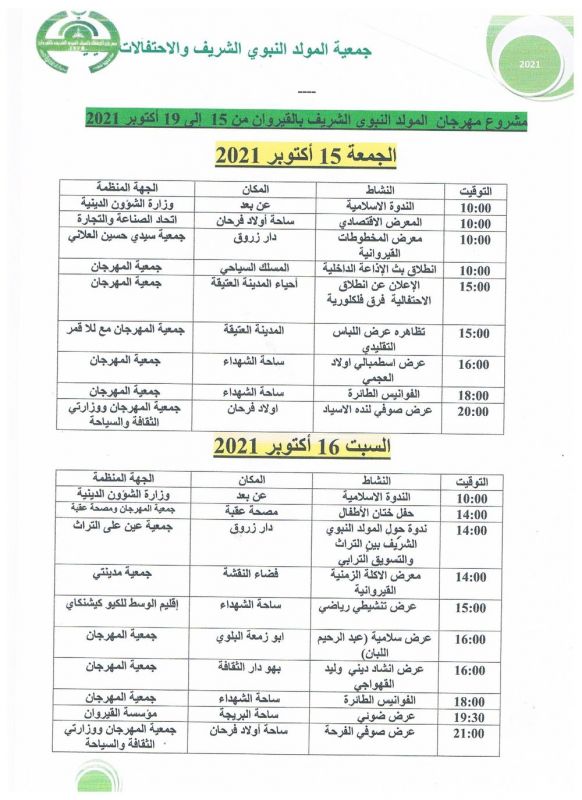 انطلقت بولاية القيروان الاستعدادات للاحتفال بذكرى المولد النبوي الشريف 12 ربيع الأول والتي توافق هذا العام يوم الإثنين 18 أكتوبر 2021.