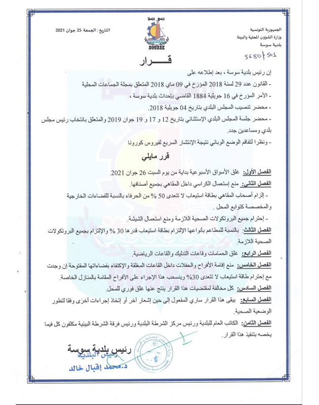 أكد رئيس بلدية سوسة محمد إقبال خالد في تصريح للجوهرة أف أم اتخاذ جملة من القرارات من بينها غلق سوق الأحد وقاعات الرياضة، وذلك على خلفية تدهور الوضع الوبائي بالجهة.