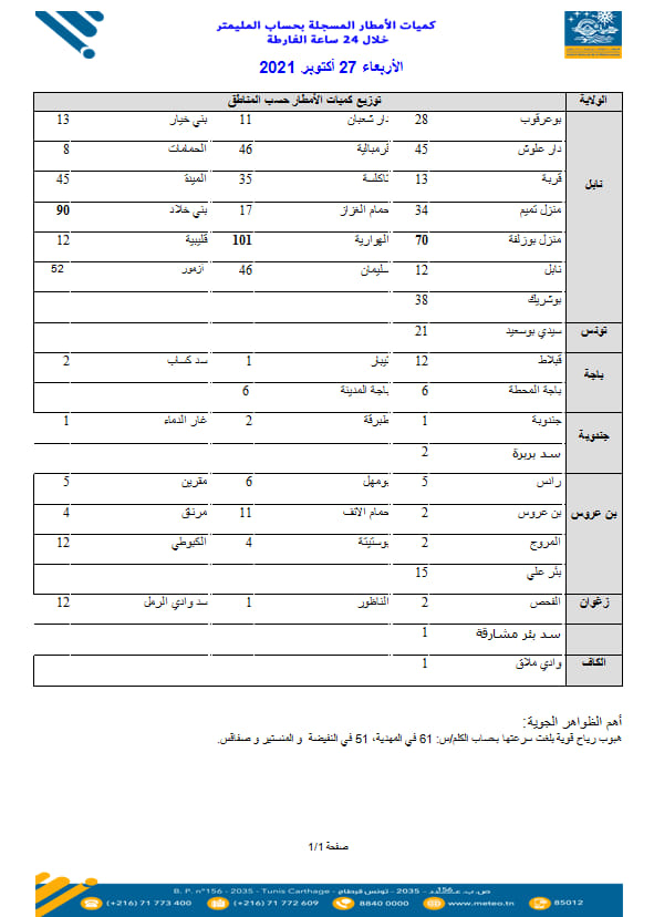 قال المهندس الأول بالمعهد الوطني للرصد الجوي، محرز الغنوشي، إن الأمطار الغزيرة التي تهاطلت على جهة الوطن القبلي بلغت أقصاها في الهوارية (101مم).