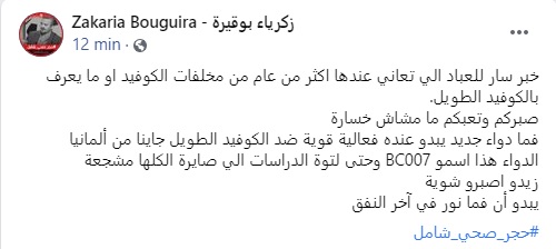 قال الدكتور، زكريا بوقيرة، إن "هناك خبرا سارا للأشخاص الذين يعانون من مخلفات الكوفيد طويل الأمد".
