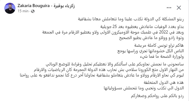 وأضاف في تدوينة نشرها على صفحته بالفايسبوك: "هاكم تراو تونس كاملة مريضة..الناس الكل خشوماتها تجري وراسها يوجع.. والوزارة الصحة ما فما شيء".