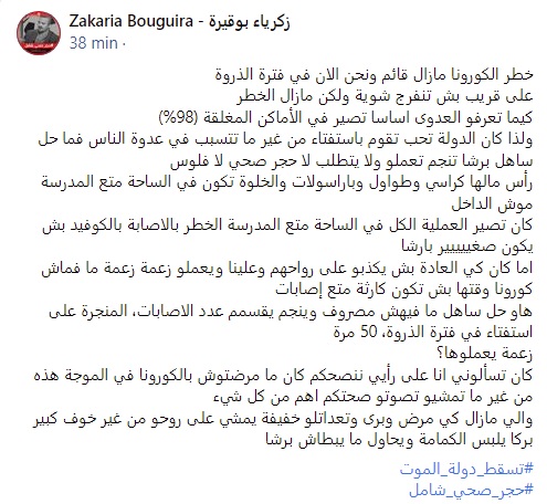 وأضاف في تدوينة نشرها على صفحته بالفايسيوك إن " العدوى تحدث أساسا في الأماكن المغلقة وأنه على الدولة الحفاظ على صحة المواطنين خلال تنظيم الاستفتاء في فضاءات مفتوحة وخيام وساحات المدارس والابتعاد عن القاعات المغلقة".