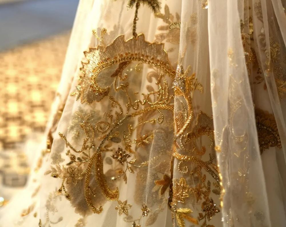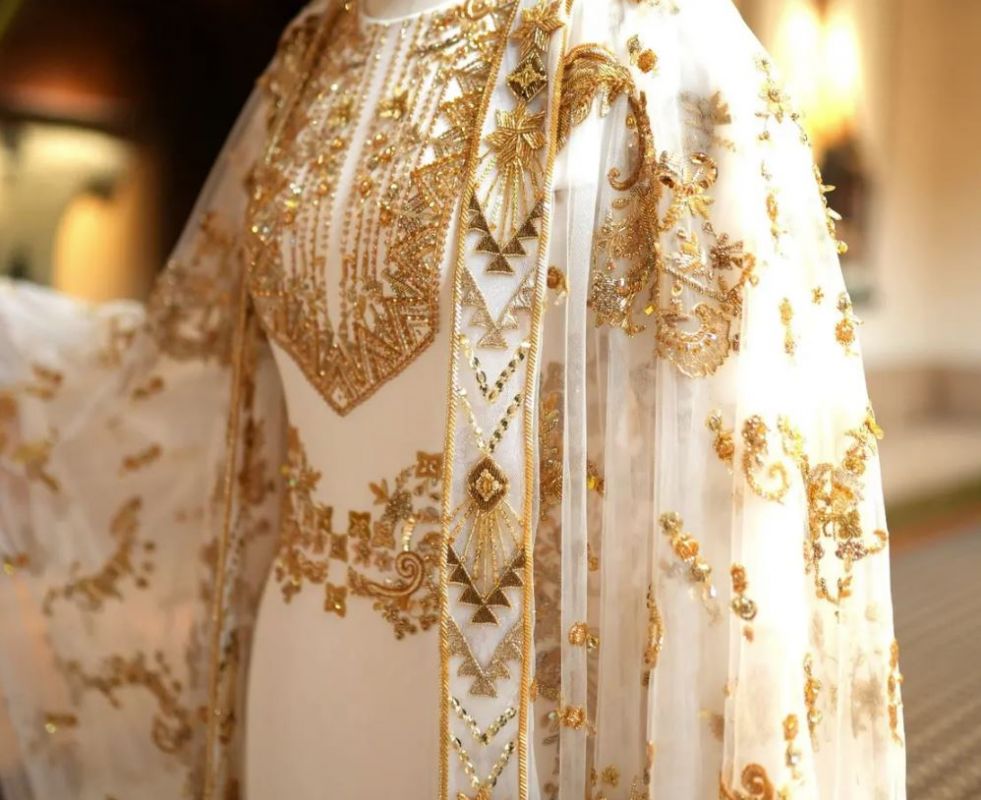 وتعد هنيدة الصيرفي أحد أشهر المصممين العرب، التي وصلت للعالمية بعد تعيينها كأول سفيرة في المملكة العربية السعودية لعلامة "شوبارد" الشهيرة. وأوضحت المصممة أنها استوحت تصميمها من الثوب النجدي أو الثوب السحابي، وهو من الأزياء التراثية السعودية، ومشهور بطول الكم الذي يتحول لطرحة العروس.