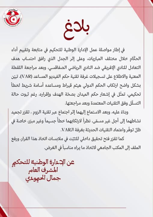 أعلنت الإدارة الوطنية للتحكيم في بلاغ لها أنه تقرر تجميد نشاط حكم "الفار" في مباراة النادي الصفاقسي والنادي الإفريقي هيثم قيراط ومساعده أسامة شريّط إلى أجل غير مسمى. الإدارة الوطنية للتحكيم أضافت أنه بعد مراجعة اللقطات المعنية والإطلاع على تسجيلات غرفة تقنية الحكم الفيديو المساعد (VAR) "تبين بشكل واضح ارتكاب الحكم الدولي هيثم قيراط ومساعده أسامة شريط لخطأ تحكيمي تمثّل في إشعار الحكم بصحة الهدف وإقراره رغم ثبوت حالة التسلل وفق التقنيات المعتمدة وبعد مراجعتها."