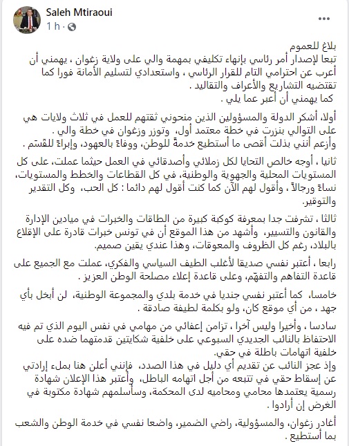 على اثر قرار إنهاء مهامه، أعلن والي زغوان، صالح المطيراوي من خلال تدوينة نشرها على موقعه بالفايسبوك عن إسقاطه لحق التتبع القانوني ضد النائب المجمد، الجديدي السبوعي الذي تم الاحتفاظ به اليوم على خلفية شكايتين تقدم بهما المطيراوي ضده في وقت سابق على خلفية اتهامات في حقه وصفها بالباطلة.