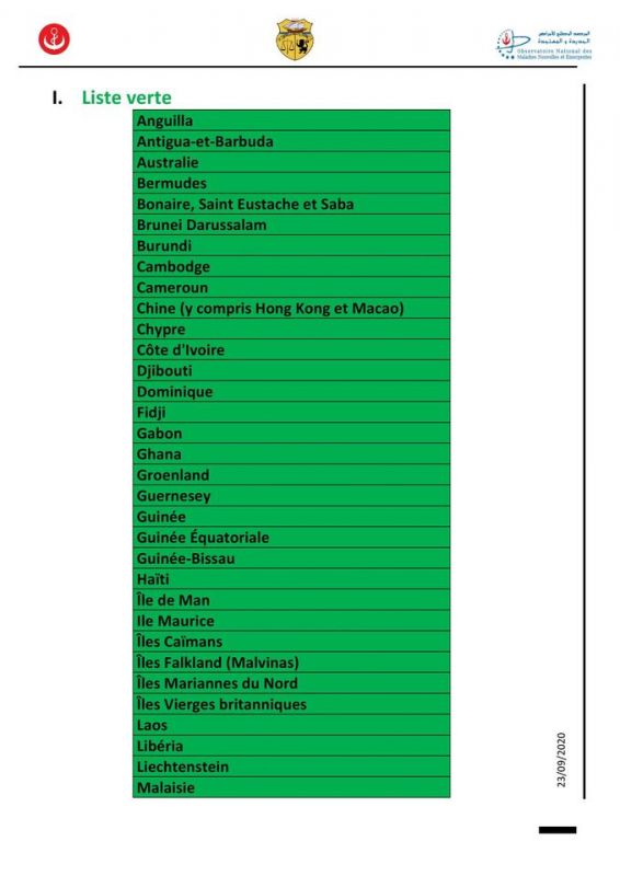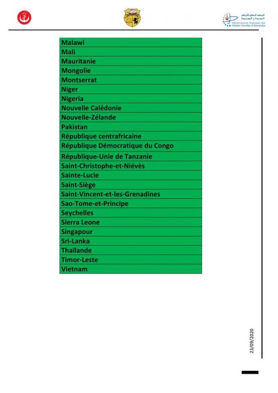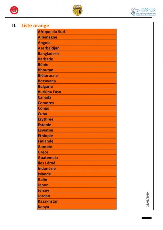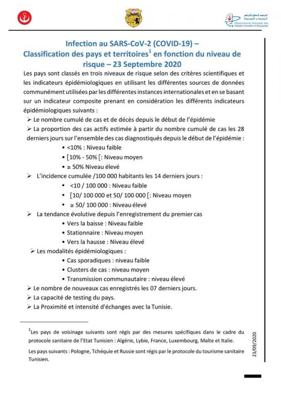 وتم إدراج عديد الدول في القائمة الحمراء على غرار فرنسا وإسبانيا والبرتغال وأنجلترا وبلجيكا وسويسرا وروسيا، وفق التصنيف الجديد للدول حسب الوضع الوبائي لفيروس كورونا، الذي نشرته وزارة الصحة بعد أكثر من شهر لآخر تحيين صدر في 20 أوت الماضي.