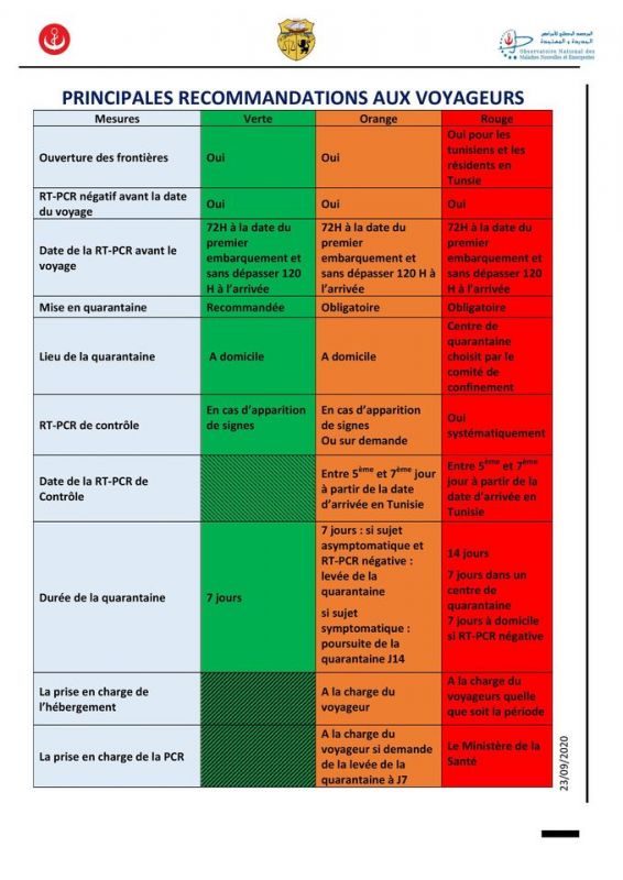 وتوصي وزارة الصحة القادمين من المناطق الخضراء بالخضوع إلى فترة حجر صحي ذاتي طيلة 7 أيام، في حين تفرضه وجوبا على الوافدين من المناطق البرتقالية في منازلهم طيلة 7 أيام.
