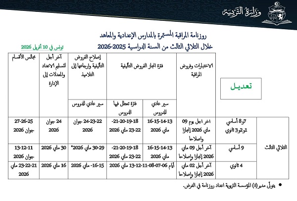 نشرت وزارة التربية روزنامة المراقبة المستمرة بالمدارس الإعدادية والمعاهد الثانوية خلال الثلاثي الثالث من السنة الدراسية 2025-2026، متضمّنة مواعيد الاختبارات وفترات إنجاز الفروض التأليفية، إلى جانب آجال تسليم الأعداد وعقد مجالس الأقسام.