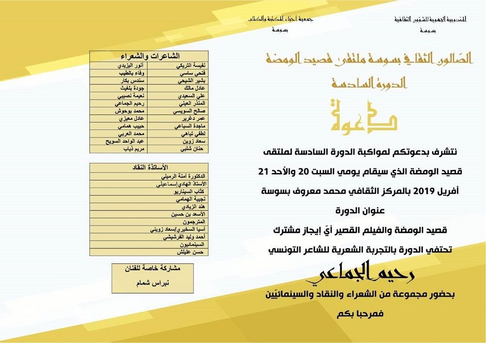 في إطار البرنامج الوطني "مدن الآداب والكتاب" تنظم المندوبية الجهوية للشؤون الثقافية بسوسة بالشراكة مع جمعية أحباء المكتبة والكتاب والصّالون الثقافي بسوسة الدورة السادسة من "ملتقى قصيد الومضة"، وذلك يوميْ السبت 20 والأحد 21 أفريل 2019 بالمركز الثقافي محمد معروف بسوسة.