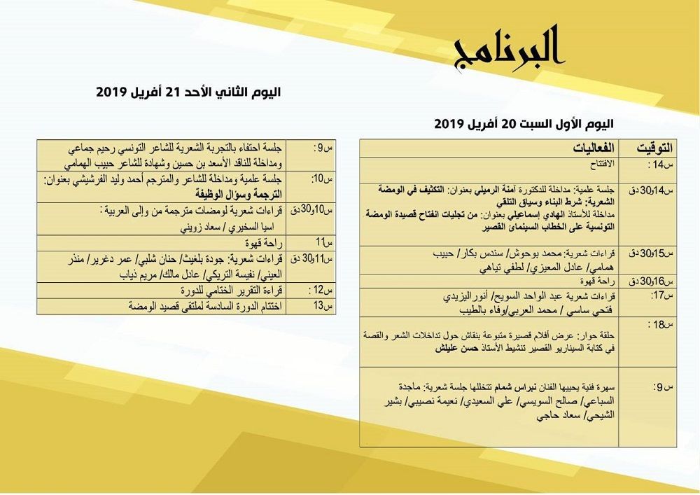 ينطلق الملتقى يوم السبت 20 أفريل في الثانية ظهرا، ثمّ تنتظم بجلسة علمية فيها مداخلة للدكتورة آمنة الرميلي بعنوان "التكثيف في الومضة الشعرية: شرط البناء وسياق التلقّي"، ومداخلة للأستاذ الهادي إسماعيلي بعنوان "من تجليات انفتاح قصيدة الومضة التونسية على الخطاب السينمائ القصير".