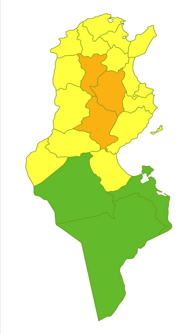 تم إسناد اللون البرتقالي لولايات سليانة، القيروان وسيدي بوزيد في اخر تحيين لخارطة اليقظة الصادر عن المعهد الوطني للرصد الجوين مما يعني ان اليقظة في مستويات عالية ودرجة الانذار شديدة نتيجة لهطولات الأمطار الغزيرة غدا والتي قد تصل إلى 120 مم وقد تتسبب في ارتفاع منسوب المياه بالمناطق المنخفضة وتشكل السيول والاودية.