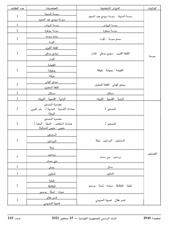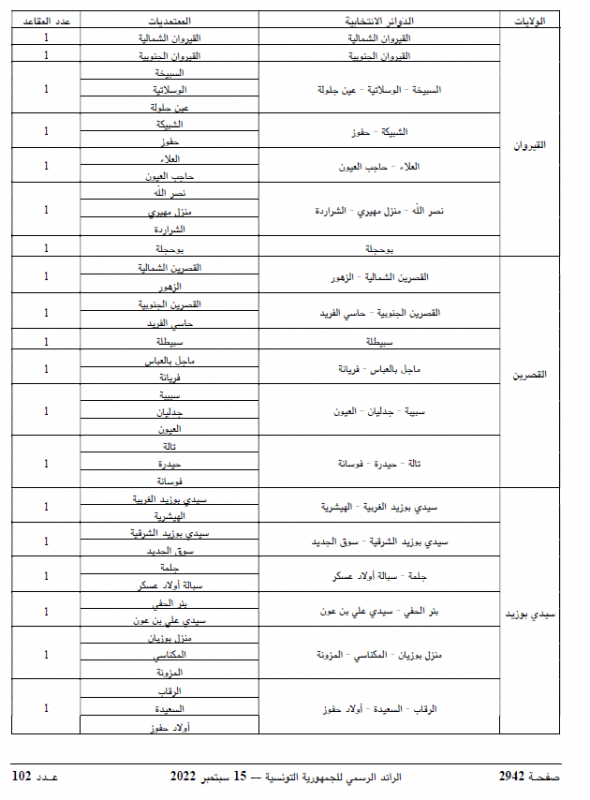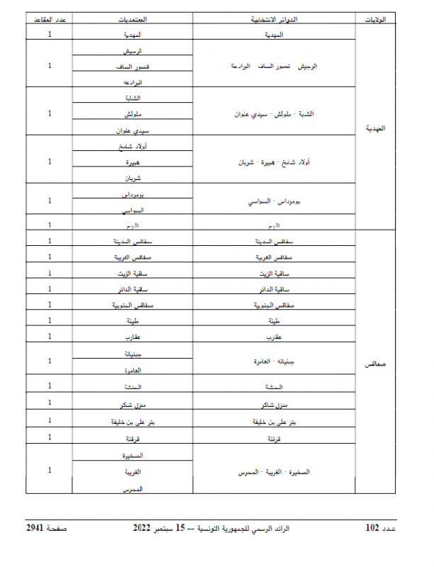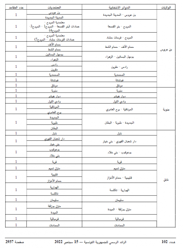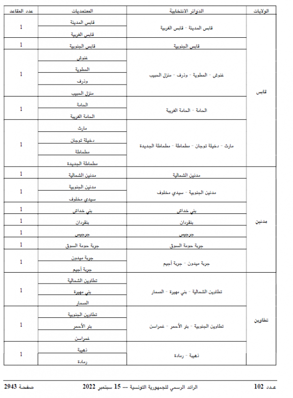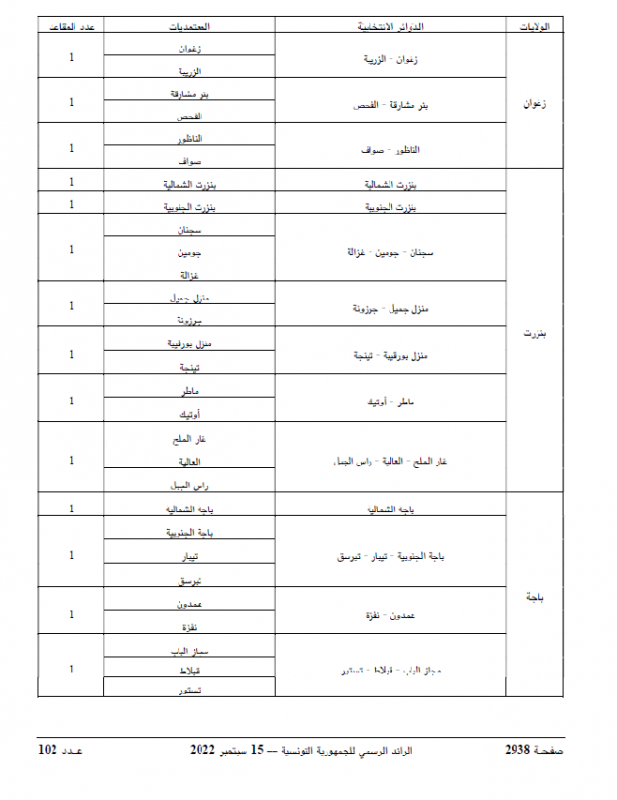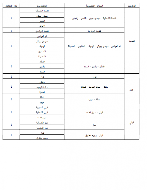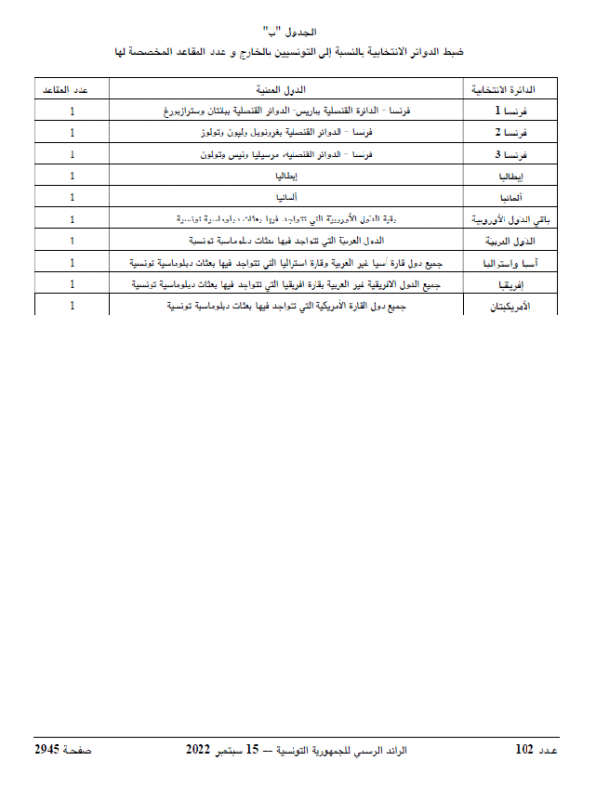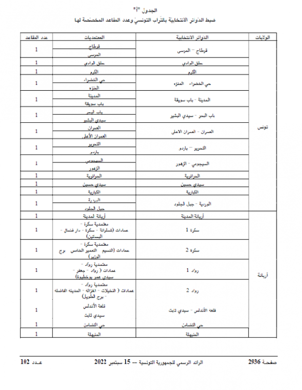 ووفق الجدول الأول المصاحب لنص المرسوم، تم في الغالب اعتماد المعتمديات داخل أرض الوطن كدائرة انتخابية، في حين ضمت بعض الدوائر أكثر من معتمدية.