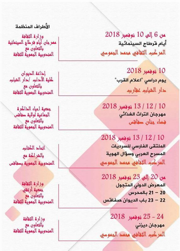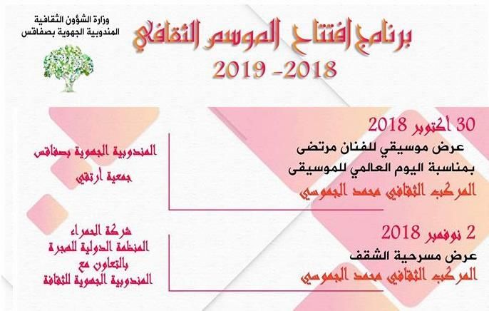 برمجت المندوبية الجهوية للشؤون الثقافية بصفاقس عدد من الأنشطة والتظاهرات التي تتنزل في إطار إفتتاح الموسم الثقافي 2018-2019 .