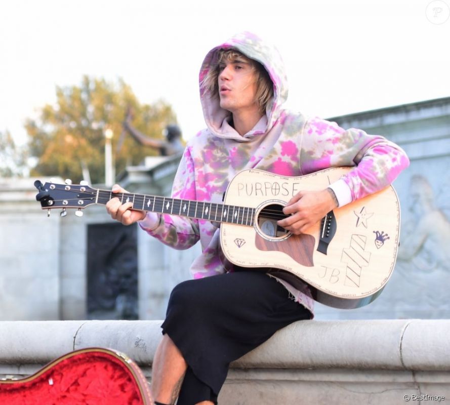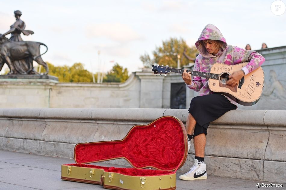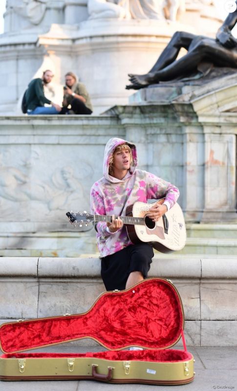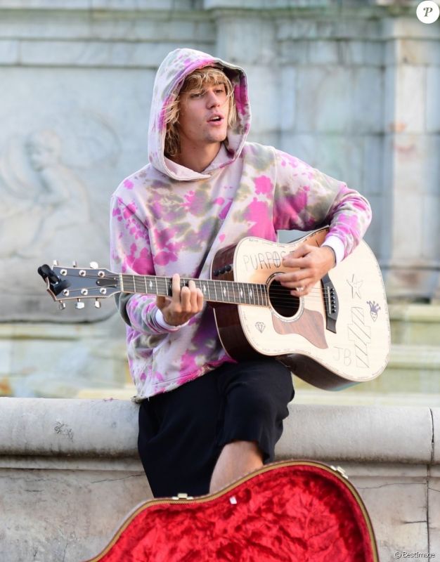 عاد النجم الكندي جاستين بيبر إلى ممارسة هوايته المفضلة ألا وهي إثارة الضجة وجذب انتباه محبي ومتابعيه ليتصدر في كل مناسبة إهتمام وسائل الإعلام العالمية فبعد الضجة التى أثراها مؤخرا حول زواجه من عارضة الأزياء هايلى بالدوين , 21 عانا ,  بإحدى الكنائس بمدينة نيويورك الأسبوع الماضى دون إخطار أى شخص نهائيا ظهر الفنان البالغ من العمر 24 عاما ليجذب أنظار وهو يغنى بجيتاره فى الشارع خارج قصر باكنجهام فى لندن.