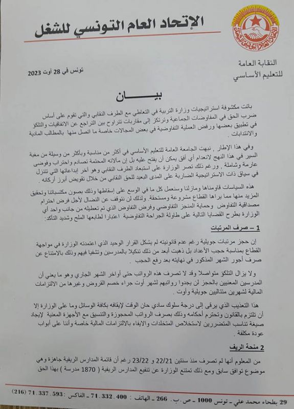 دعت الجامعة العامة للتعليم الأساسي، وزارة التربية في بيان اليوم الاثنين، إلى "مفاوضات عاجلة بخصوص جملة من القضايا وصفتها بالحارقة"، مُشدّدة على "ضرورة التفاوض لتجنب التداعيات السلبية لهذه القضايا ومن أجل انصاف المتضررين منها في اسرع وقت".
