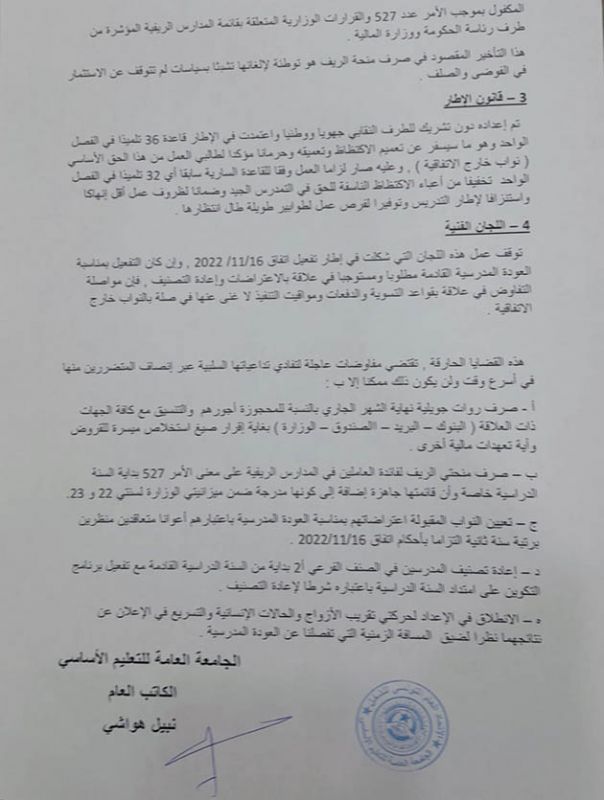 وطالبت الجامعة، في بيانها "بصرف منحتي الريف لفائدة المعلمين في المدارس الريفية وتعيين النواب المقبولة اعتراضاتهم بمناسبة العودة المدرسية باعتبارهم اعوانا متعاقدين منظرين برتبة سنة ثانية وإعادة تصنيف المدرسين في الصنف الفرعي "أ2" بداية من السنة الدراسية القادمة مع تفعيل برنامج التكوين على امتداد السنة الدراسية باعتباره شرطا لاعادة التصنيف".