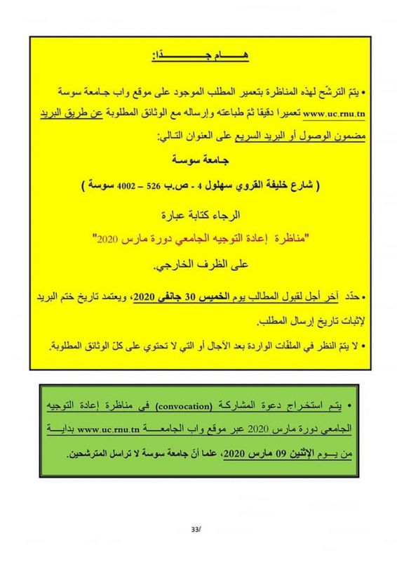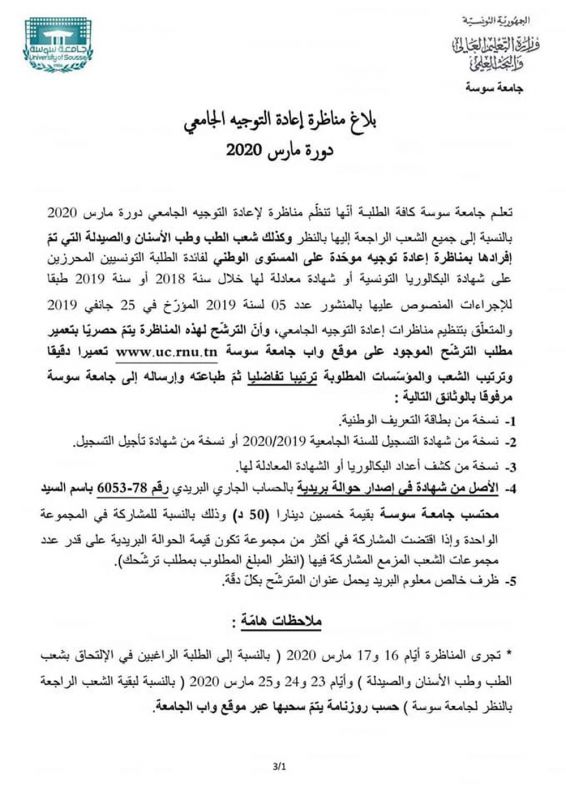 أعلنت جامعة سوسة في بلاغ عن تنظيمها مناظرة لإعادة التوجيه الجامعي دورة مارس 2020 وذلك أيّام 16و17و23و24و25 مارس 2020.