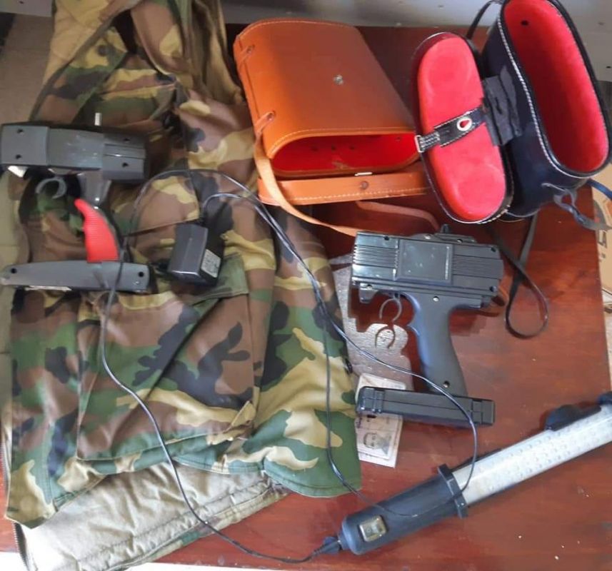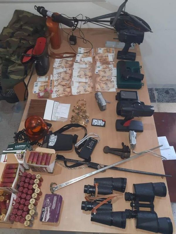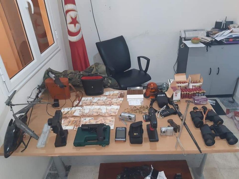 وبعد التنسيق مع النيابة العمومية بالمحكمة الابتدائية بجندوبة قامت فرقة الشرطة العدلية بجندوبة بمداهمة منزل هذا الشخص الكائن بأحواز مدينة جندوبة، حيث تم حجز مسدس ناري، ومبلغ مالي يقدر بـ5000 اورو، وكمية هامة من المصوغ ومعدات حربية متمثلة في مناظير ليلية، وكمية هامة من خراطيش الصيد، وجمازة عسكرية، واضواء رفافة ذات استعمال امني، وطائرة مسيّرة "درون" ومعداتها، 4 كاميرات تصوير متطورة، و2 جراب عسكري لحمل المناظير الليلية، وآلة لحشو خراطيش الصيد.