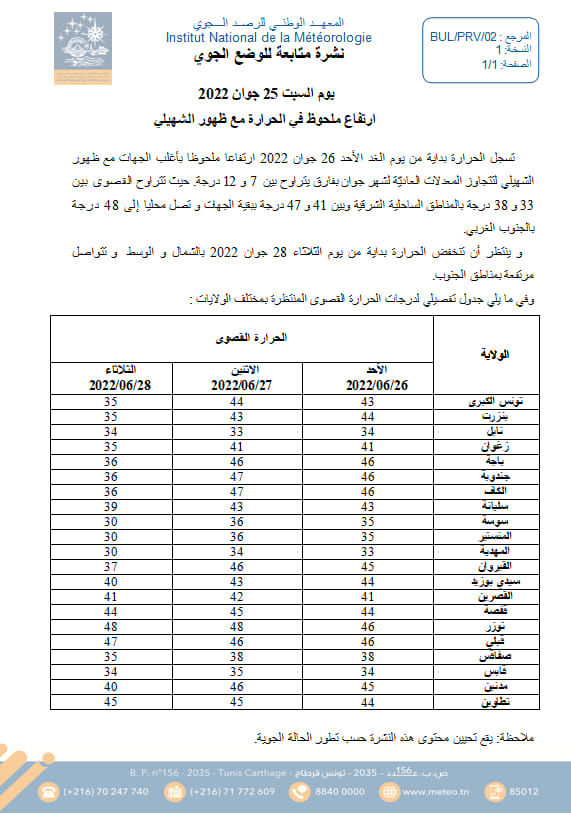 وستشهد درجات الحرارة تراجعا بداية من، الثلاثاء 28 جوان 2022، بالشمال والوسط وتتواصل مرتفعة بمناطق الجنوب.