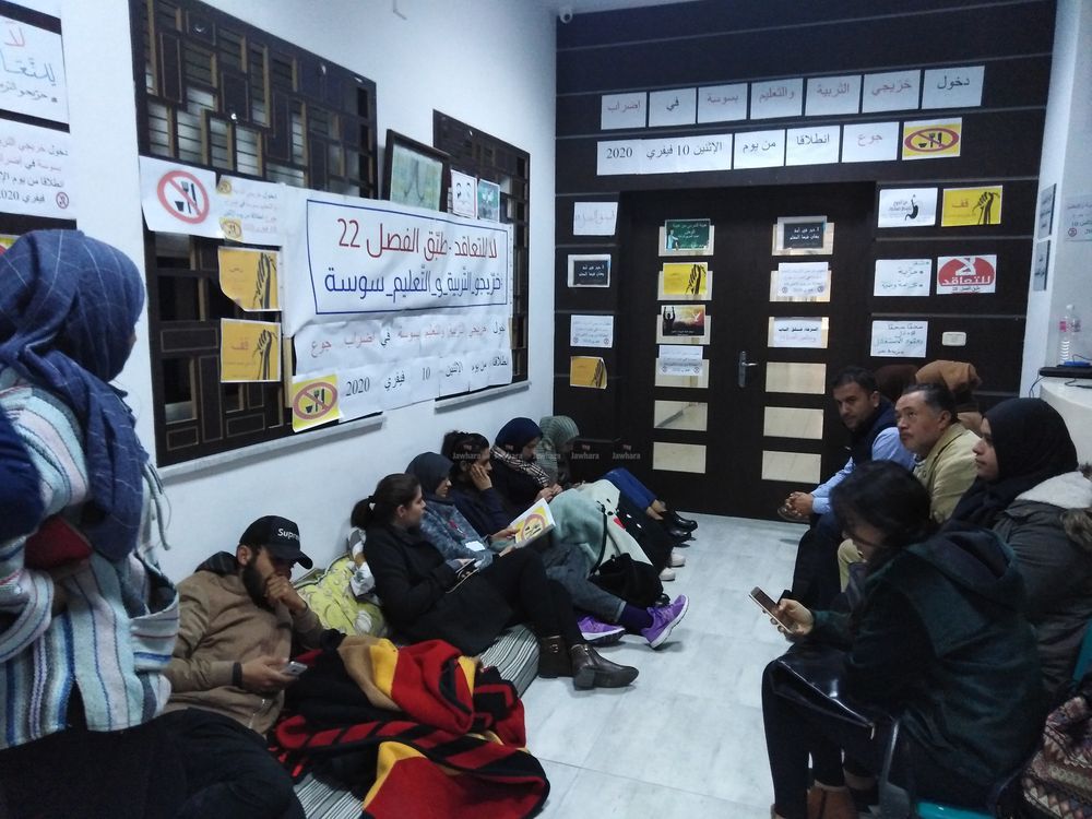 يواصل خرّيجو التربية والتعليم اعتصامهم وإضراب الجوع لليوم الرابع على التوالي بمقرّ المندوبية الجهوية للتربية بسوسة، لمطالبة وزارة الإشراف بتسوية وضعياتهم المهنية.