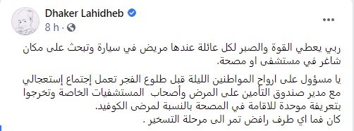 دعا الدكتور ذاكر لهيذب إلى "عقد إجتماع إستعجالي مع مدير صندوق التأمين على المرض وأصحاب المصحات الخاصة و إقرار تعريفة موحدة للتكفل بمرضى الكوفيد".