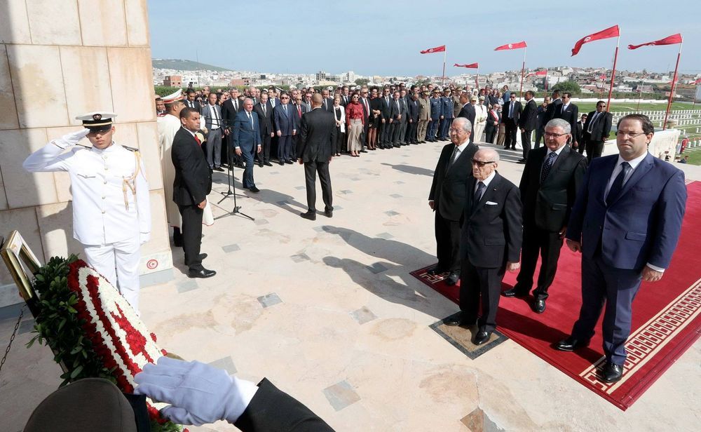 وقد تولى رئيس الدولة ، الذي كان مرفوقا برئيس البرلمان محمد الناصر ورئيس الحكومة يوسف الشاهد ، تحية العلم بروضة الشهداء على أنغام النشيد الوطني واستعراض تشكيلة من الجيوش الثلاثة قبل التوجه الى النصب التذكاري ووضع اكليل من الزهور وتلاوة الفاتحة ترحما على أرواح الشهداء الطاهرة يشار ان الموكب حضره الى جانب والي بنزرت محمد قويدر عدد من أعضاء الحكومة وعدد من ممثلي الاحزاب السياسية ومن أعضاء مجلس نواب الشعب ومن ممثلي المجتمع المدني فضلا عن ثلة من من قدماء المقاومين والاطارات الجهوية .