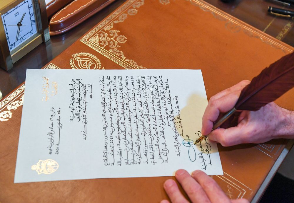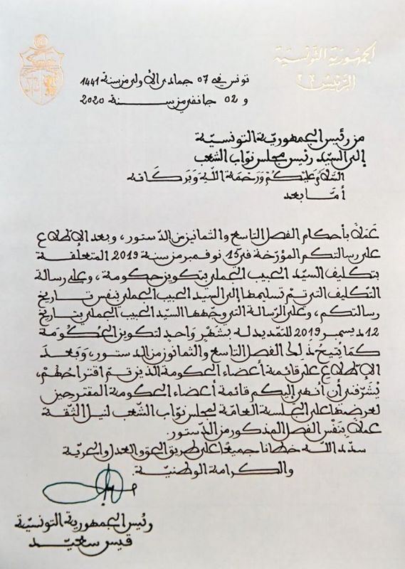 أمضى رئيس الجمهورية قيس سعيّد اليوم الخميس 2 جانفي 2020 رسالة موجهة إلى راشد الغنوشي رئيس مجلس نواب الشعب، بعد أن تسلّم القائمة التي عرضها عليه الحبيب الجملي المكلّف بتكوين الحكومة وذلك عملا بأحكام الفصل التاسع والثمانين من الدستور.