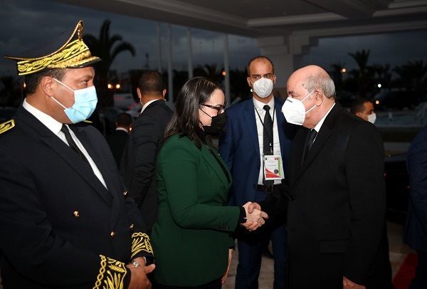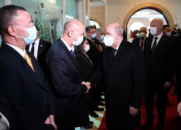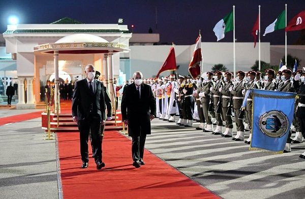 وحيّا رئيس الدولة والرئيس الجزائري العلم على أنغام النشيدين الرسميين للبلدين كما استعرضا تشكيلة من الجيوش الثلاثة أدت لهما التحية.