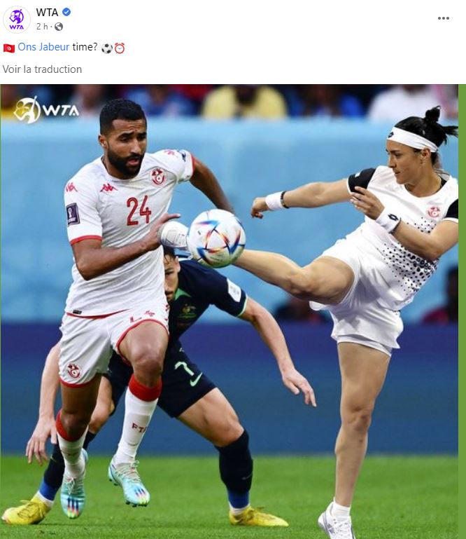 نشر الحساب الرسمي لرابطة لاعبات التنس المحترفات اليوم عبر" الفيسبوك" صورة معدلة بالفوتوشوب، لبطلتنا التونسية أنس جابر وهي بصدد اللعب مع عناصرنا الوطنية مرفوقة بتدوية كتب عليها "حان الوقت الان " أي حان الوقت لتشريك أنس.