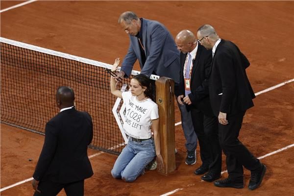 بدوره، قال الاتحاد الفرنسي للتنس: "تمكنت ناشطة بيئية من الوصول إلى ملعب فيليب شاترييه وربطت نفسها بالشبكة بأسلاك معدنية وغراء".