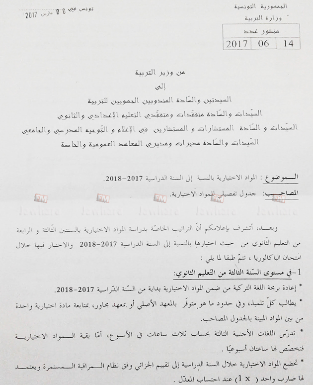 ونص المرسوم الذي تلقته مختلف المندوبيات الجهوية للتريبة أمس الثلاثاء، وتحصلت الجوهرة أف أم نسخة منه، على إعادة برمجة اللغة التركية ضمن المواد الإختيارية بداية من السنة الدراسية القادمة.