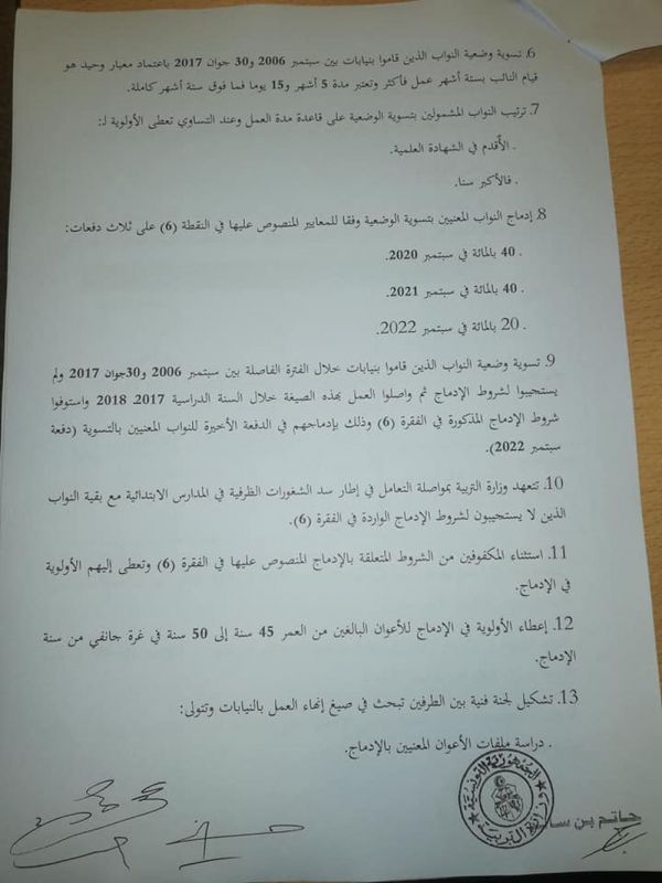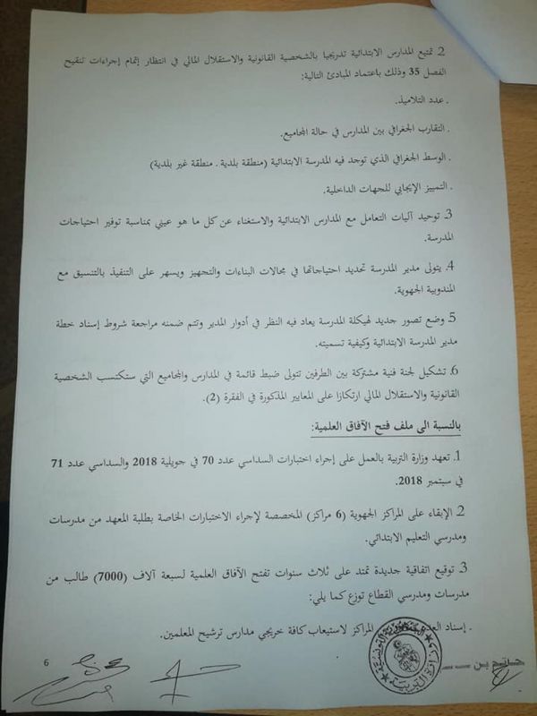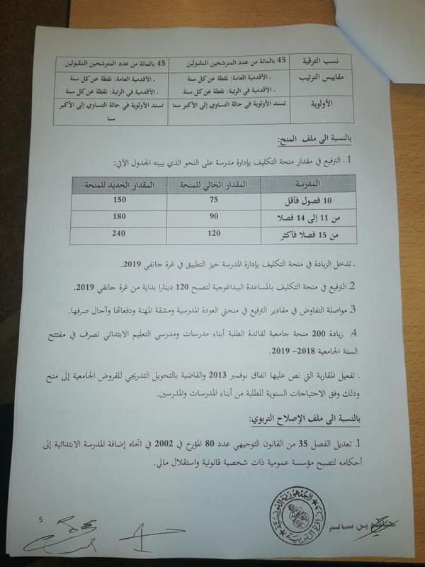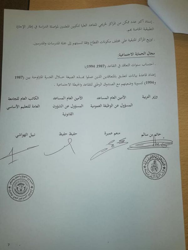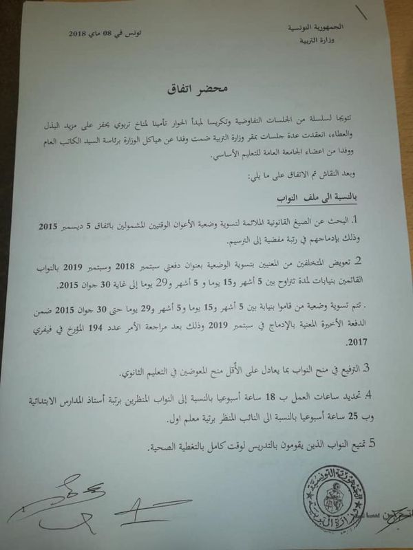 أعلنت الجامعة العامة للتعليم الأساسي على صفحتها على الفايسبوك عن التوقيع الرسمي لمحضر الاتفاق بينها وبين وزارة التربية وهو ما سيترتب عنه الغاء الإضراب الذي كان مقررا يومي 9 و10 ماي 2018.