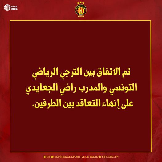 أعلن الترجي الرياضي التونسي عن نهاية العلاقة التعاقدية مع مدربه راضي الجعايدي بعد الانسحاب من مسابقة الكأس امام هلال مساكن يوم أمس.ونشرت الصفحة الرسمية للترجي بيانا عبر الفايسبوك جاء فيه "تم الاتفاق بين الترجي الرياضي التونسي والمدرب راضي الجعايدي على إنهاء التعاقد".