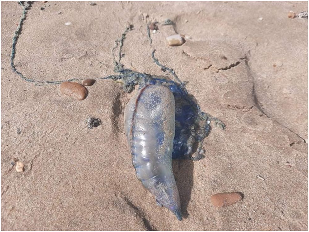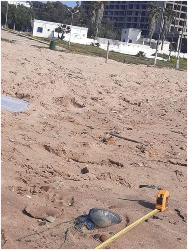 وقد تحول فريق علمي من المعهد الوطني لعلوم وتكنولوجيا البحار إلى عين المكان، حيث عاين وتبين وجود حرّيقة وحيدة، يبلغ طول مجساتها "Tentacules" أكثر من 50 صم وقيس عوامتها "Flotteur" حوالي 20 صم ولونها أزرق مائل إلى البنفسجي.