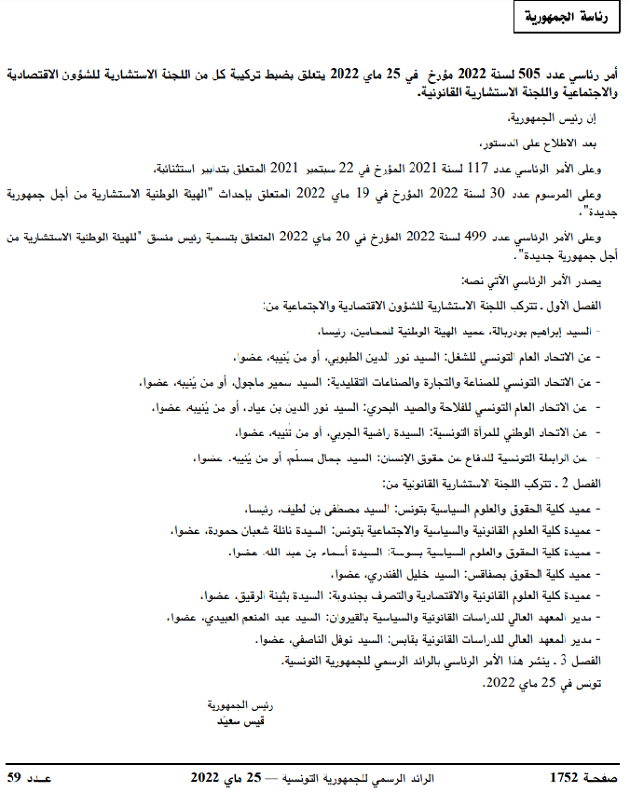 وكان رئيس الجمهورية قيس سعيد قد أصدر الأسبوع الماضي مرسوما رئاسيا عدد 30 لسنة 2022 يتعلق بإحداث الهيئة الوطنية الاستشارية من أجل جمهورية جديدة، التي تتوزع على ثلاث لجان وهي اللجنة الاستشارية للشؤون القانونية والاقتصادية (تضم ممثلين عن اتحاد الشغل، واتحاد الصناعة، واتحاد المرأة، واتحاد الفلاحين)، واللجنة الاستشارية للشؤون القانونية تضم عمداء كليات الحقوق والعلوم القانونية والسياسية، ولجنة الحوار الوطني (تضم أعضاء اللجنتين المشار إليهما آنفا).