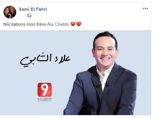 نشر صاحب قناة الحوار التونسي "سامي الفهري" مساء اليوم الاثنين، صورة على صفحته الرسمية بموقع التواصل الاجتماعي، للمنشط بنفس القناة "علاء الشابي" توجه من خلالها بالتهنئة إثر إعلان قناة التاسعة انضمام "الشابي" لأسرة القناة.