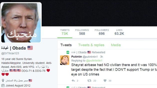 عمد العديد من المواطنين السوريين إلى تغيير صور حساباتهم الخاصة على مواقع التواصل الاجتماعي "فيسبوك" إلى صورة "منحبك يا ترامب"، بعد الضربات الامريكية التي وجهتها ادارة ترامب لمطار الشعيرات أمس الجمعة.