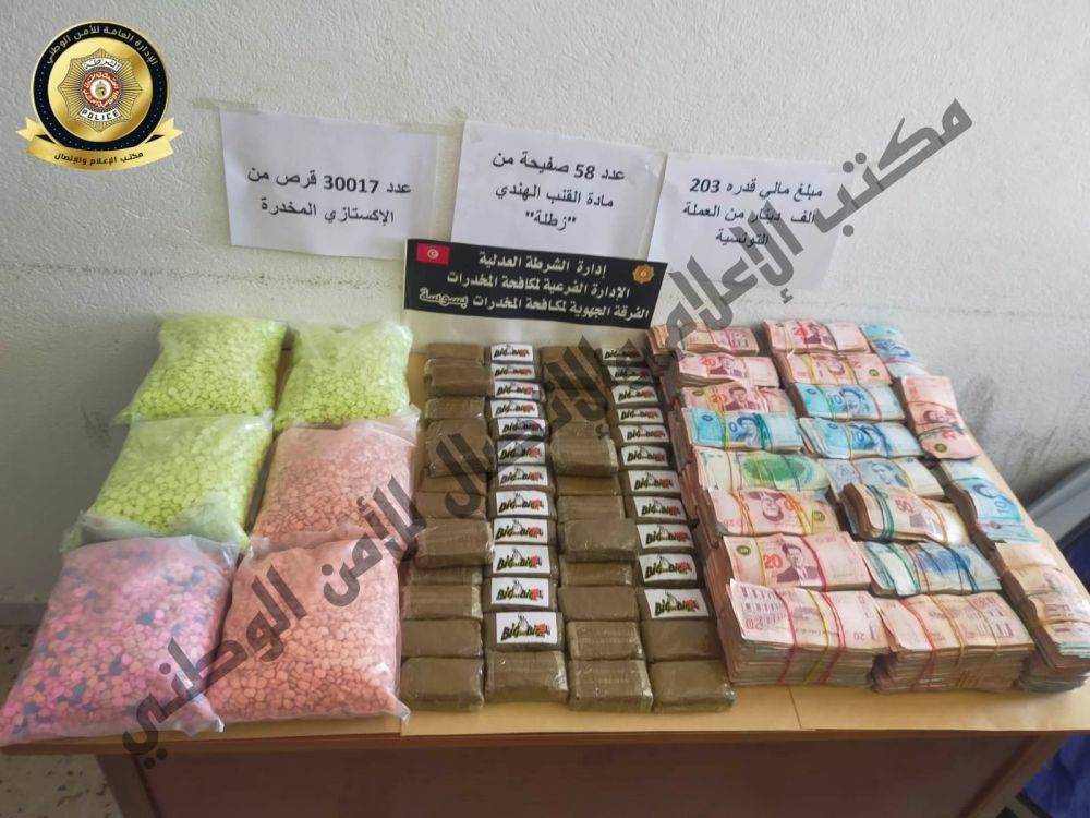 ووفق بلاغ للإدارة العامة للأمن الوطني، تمكنن الوحدات الأمنية من حجز 30 ألف و 17 قرص مخدّر نوع إكستازي، 58 صفيحة من مخدّر القنب الهندي، مبلغ مالي قدره 203 ألف دينار من العملة التونسية وآخر من العملة الأجنبية، بندقية صيد، 146 إطلاقة، سيارة ودراجة نارية ثقيلة.وقُدّرت القيمة الجملية للمحجوز بحوالي مليون دينار.
