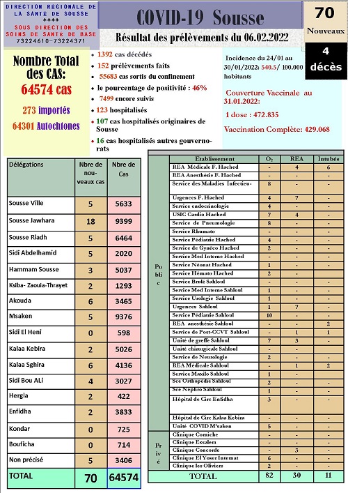 أعلنت الإدارة الجهوية للصحة بسوسة عن تسجيل 4 وفيات و70 إصابة جديدة بفيروس كورونا وذلك بتاريخ 6 فيفري الحالي.