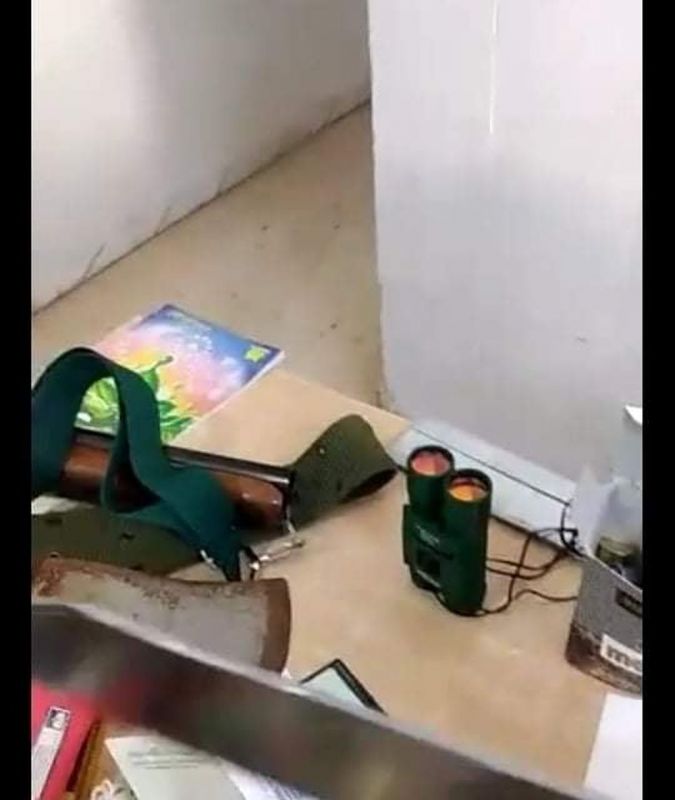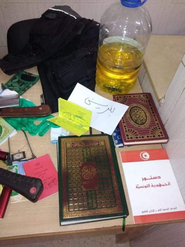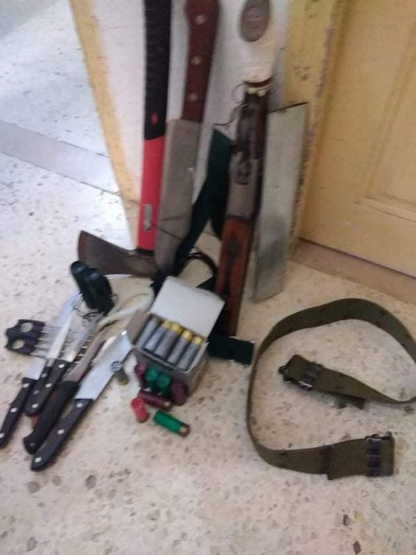 وبتفتيش المنزل تمّ العثور على بندقية الصيد و30 خرطوشة، كما تمّ العثور على مجموعة من السكاكين والأسلحة البيضاء، ونسخة من الدستور وكتب دينية ودعوية تحريضية، إضافة إلى جمازة خاصة بقوات الأمن الوطني، وقاذفة مسامير ووعاء بنزين، ومنظار نهاري، وصورة شخص يقوم بتقليد طريقة الدواعش في الإعدام عن طريق الذبح.