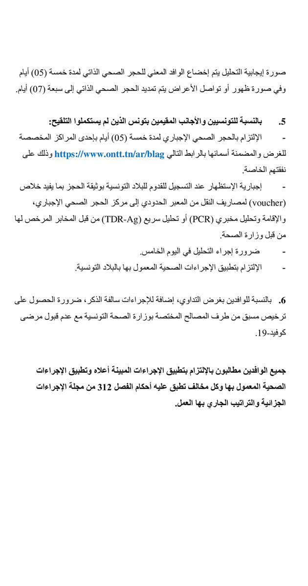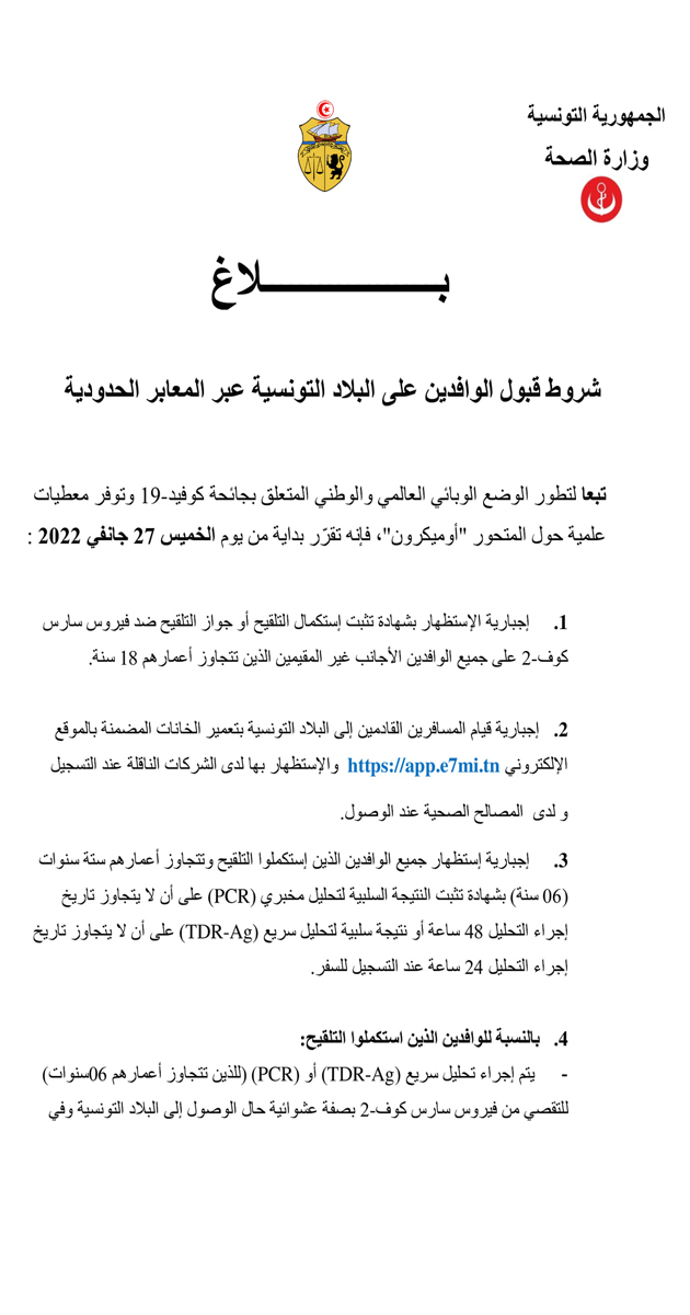 نشرت وزارة الصحة اليوم الخميس تحيينا للإجراءات التي سيتم العمل بها لقبول الوافدين على تونس عبر المعابر الحدودية و ذلك تبعا لتطور الوضع الوبائي العالمي و الوطني المتعلق بجائحة كورونا و توفر معطيات علمية حول المتحور "أوميكرون".