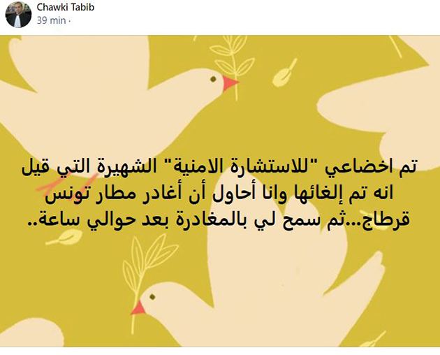 وقال الطبيب في نفس التدوينة : تم" اخضاعي "للاستشارة الامنية" الشهيرة التي قيل انه تم إلغاؤها وانا أحاول أن أغادر مطار تونس قرطاج...ثم سُمح لي بالمغادرة بعد حوالي ساعة."
