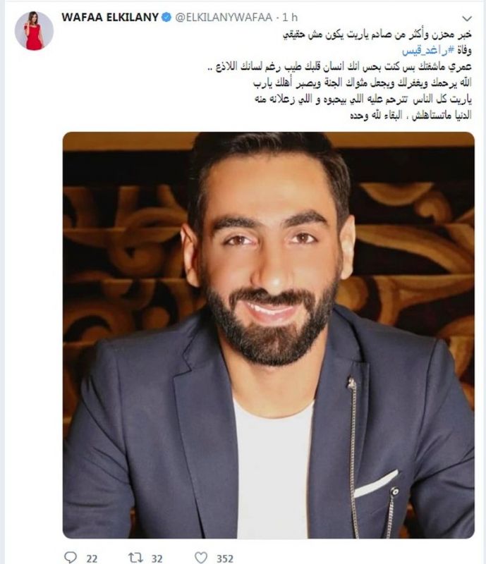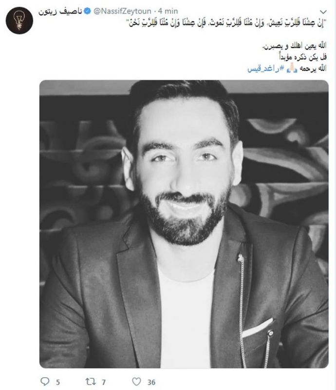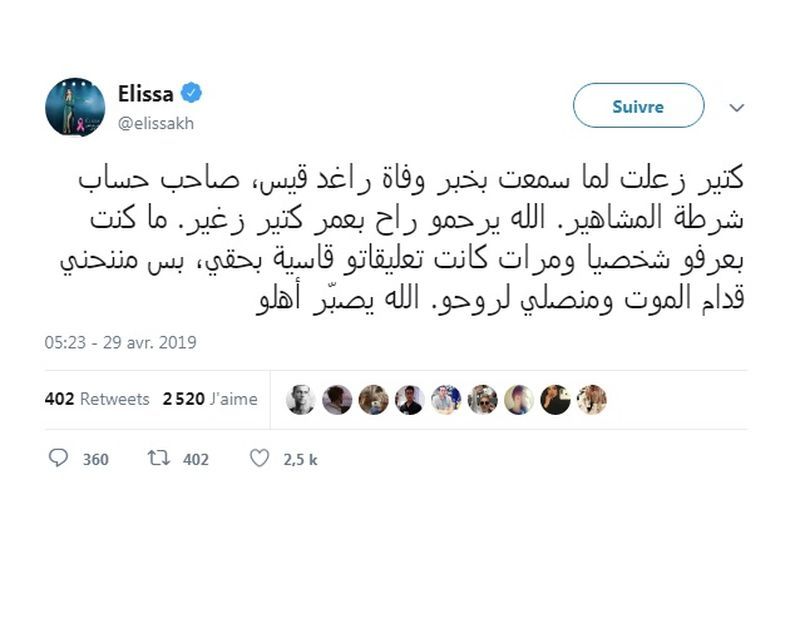 وكانت الفنانة اليسا أول المعزين في وفاة الصحفي اللبناني، حيث نشرت تغريد على موقع التواصل الاجتماعي تويتر قالت فيها: "كتير زعلت لما سمعت بخبر وفاة راغد قيس، صاحب حساب شرطة المشاهير".