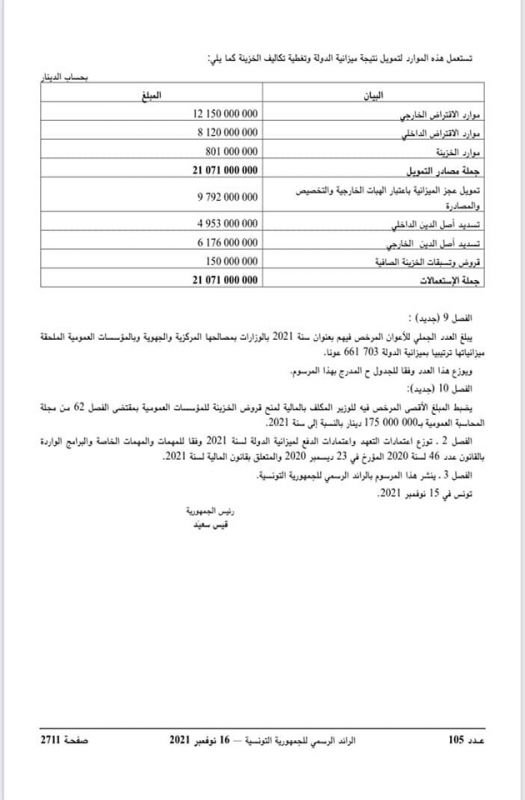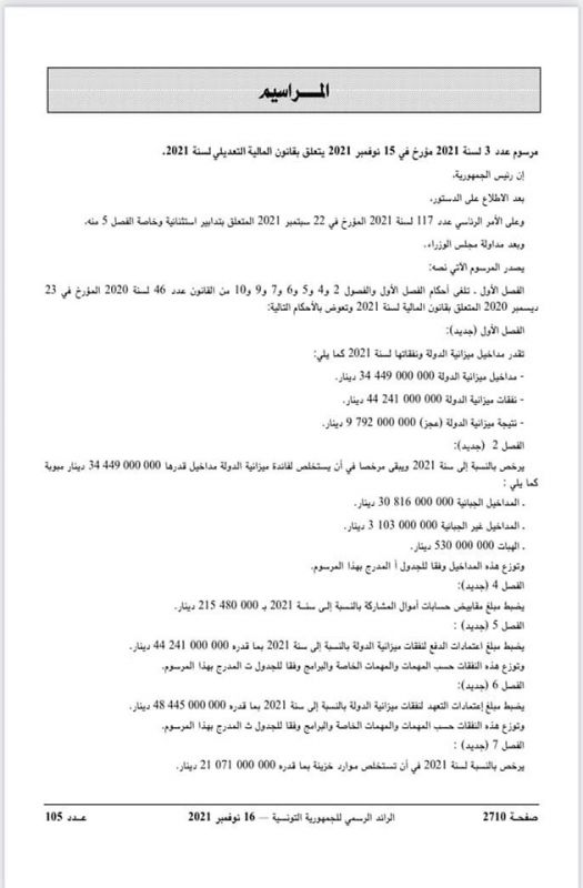 صدر بالرائد الرسمي اليوم مرسوم رئاسي عدد 3 مؤرخ في 15 نوفمبر 2021 يتعلق بقانون المالية التعديلي لسنة 2021.