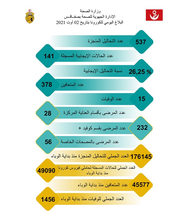 أفادت الإدارة الجهوية للصحة بصفاقس بأنه تم بتاريخ 2 أوت الحالي، تسجيل 15 حالة وفاة و141 إصابة جديدة بفيروس كورونا.